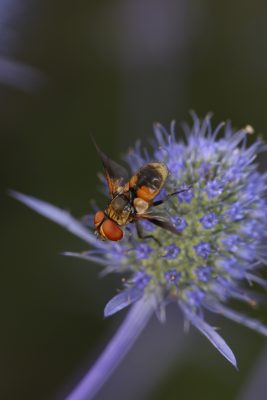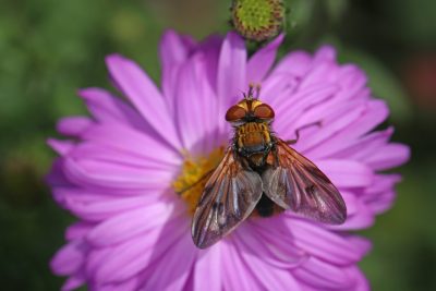 Am auffälligsten sind die großen Männchen (in den Bildern auf der Aster), die Weibchen sind weniger spektakulär. Wie der Name sagt, gehört der coole Brummer zu den Raupenfliegen, eine durchweg parasitische Familie, die sich im Körper anderer Insekten, meist Raupen, entwickeln. Diese Art aber legt ihre Eier auf Wanzen und die Larve wächst in deren Körper heran und tötet ihren Wirt damit ab. Wanzen finden diese Fliege also alles andere als cool. Da auch große Baumwanzen im Botanischen Garten häufig sind, findet sie reichlich Opfer.